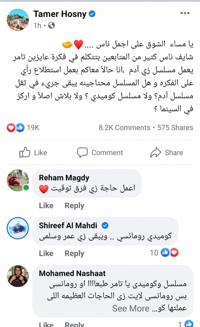 وكتب "حسني": "شايف ناس كتير من المتابعين بتتكلم في فكرة عايزين تامر يعمل مسلسل زي آدم، أنا حالًا معاكم بعمل استطلاع رأي على الفكرة وهل المسلسل محتاجينه يبقى جريء في ثقل مسلسل آدم؟ ولا مسلسل كوميدي؟ ولا بلاش اصلًا وأركز في السينما؟".