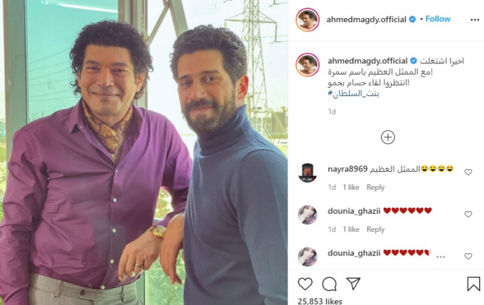 ونشر أحمد مجدي صورة تجمعهما، عبر حسابه الرسمي بموقع "إنستجرام"، وعلق: "أخيرًا اشتغلت مع الممثل العظيم باسم سمرة، انتظروا لقاء حسام بحمو، بنت السلطان".