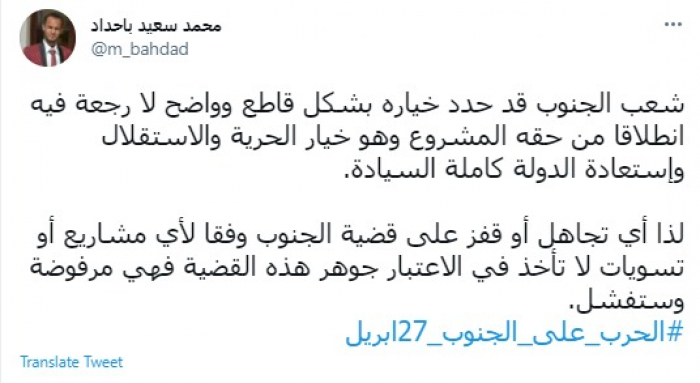 وقال في تغريدة عبر "تويتر" رصدها "المشهد العربي": "شعب الجنوب قد حدد خياره بشكل قاطع وواضح لا رجعة فيه انطلاقًا من حقه المشروع وهو خيار الحرية والاستقلال واستعادة الدولة كاملة السيادة".