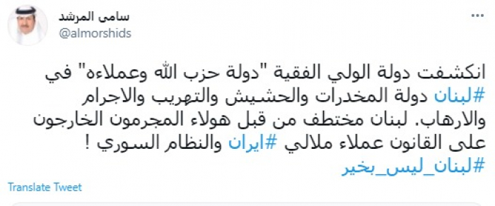 وكتب في تغريدة عبر "تويتر" رصدها "المشهد العربي": "انكشفت دولة الولي الفقية دولة حزب الله وعملاءه في لبنان دولة المخدرات والحشيش والتهريب والإجرام والإرهاب".