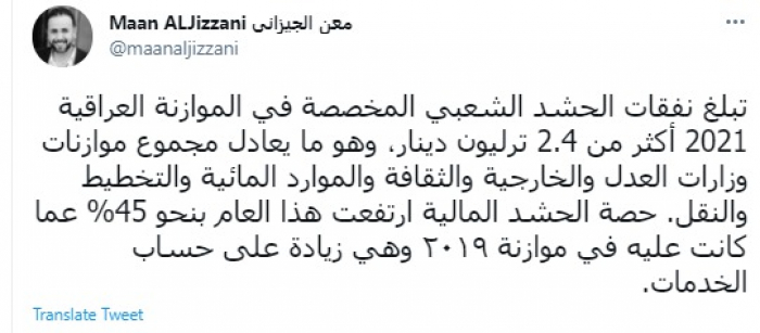 وقال في تغريدة عبر "تويتر" رصدها "المشهد العربي": "تبلغ نفقات الحشد الشعبي المخصصة في الموازنة العراقية 2021 أكثر من 2.4 ترليون دينار، وهو ما يعادل مجموع موازنات وزارات العدل والخارجية والثقافة والموارد المائية والتخطيط والنقل. حصة الحشد المالية ارتفعت هذا العام بنحو 45% عما كانت عليه في موازنة ٢٠١٩ وهي زيادة على حساب الخدمات".