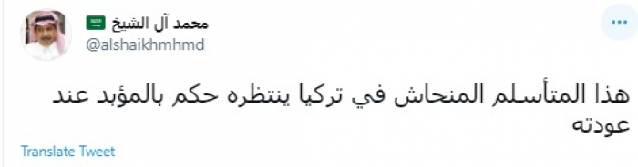 وكتب في تغريدة عبر "تويتر" رصدها "المشهد العربي": "هذا المتأسلم ..... في تركيا ينتظره حكم بالمؤبد عند عودته".