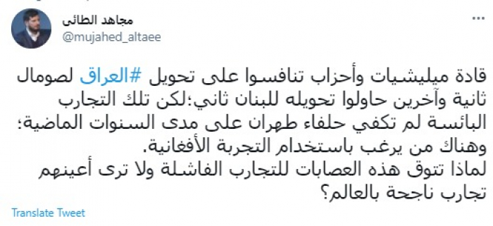 وكتب في تغريدة عبر "تويتر" رصدها "المشهد العربي": "قادة ميليشيات وأحزاب تنافسوا على تحويل العراق لصومال ثانية وآخرين حاولوا تحويله للبنان ثاني؛لكن تلك التجارب البائسة لم تكفي حلفاء طهران على مدى السنوات الماضية؛وهناك من يرغب باستخدام التجربة الأفغانية".