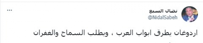 وقال في تغريدة على حسابه بموقع التدوين المصغر تويتر، اليوم إن: "أردوغان يطرق أبواب العرب، ويطلب السماح والغفران".