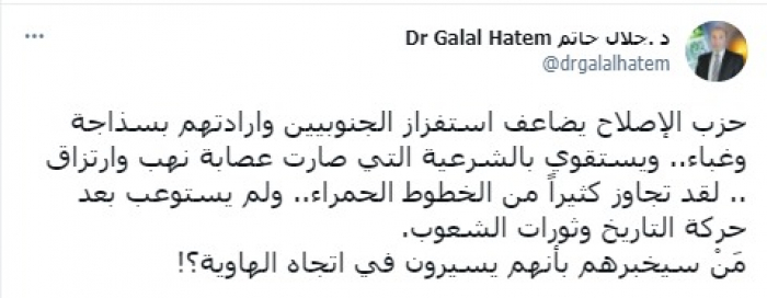 رأى الأكاديمي الدكتور جلال حاتم رئيس جامعة أم القيوين الإماراتية، أن حزب الإصلاح الإخواني يواصل استفزاز الجنوبيين، والاستقواء بالشرعية الإخوانية، مؤكدا أنهم يسيرون في اتجاه الهاوية.