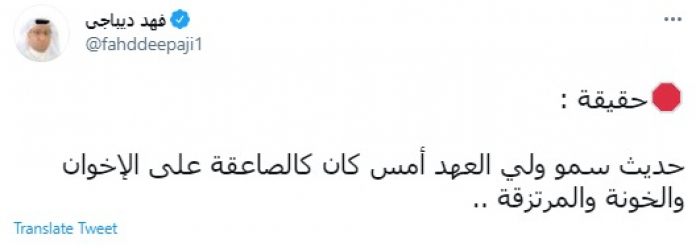 وكتب في تغريدة عبر "تويتر" رصدها "المشهد العربي": "حقيقة: حديث سمو ولي العهد أمس كان كالصاعقة على الإخوان والخونة والمرتزقة".