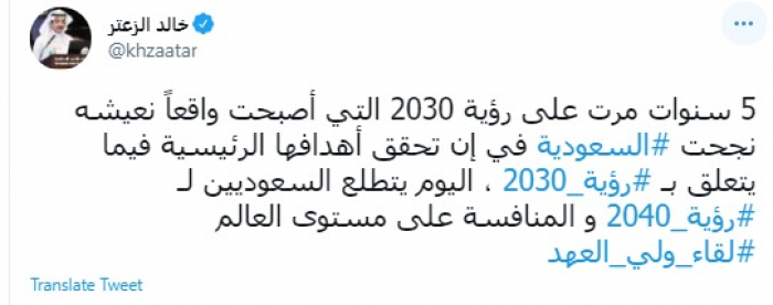 وكتب في تغريدة عبر "تويتر" رصدها "المشهد العربي": "5 سنوات مرت على رؤية 2030 التي أصبحت واقعاً نعيشه نجحت السعودية في إن تحقق أهدافها الرئيسية فيما يتعلق برؤية 2030 ، اليوم يتطلع السعوديين لرؤية 2040 والمنافسة على مستوى العالم لقاء ولي العهد".