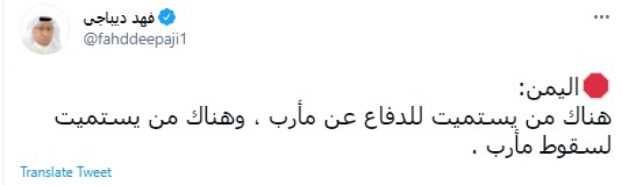 وقال في تغريدة عبر "تويتر" رصدها "المشهد العربي": "اليمن: هناك من يستميت للدفاع عن مأرب ، وهناك من يستميت لسقوط مأرب".