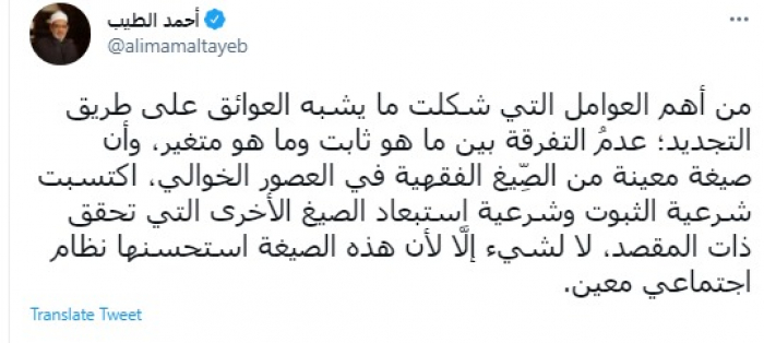 وكتب في تغريدة عبر "تويتر" رصدها "المشهد العربي": "من أهم العوامل التي شكلت ما يشبه العوائق على طريق التجديد؛ عدمُ التفرقة بين ما هو ثابت وما هو متغير، وأن صيغة معينة من الصِّيغ الفقهية في العصور الخوالي، اكتسبت شرعية الثبوت وشرعية استبعاد الصيغ الأخرى التي تحقق ذات المقصد، لا لشيء إلَّا لأن هذه الصيغة استحسنها نظام اجتماعي معين".