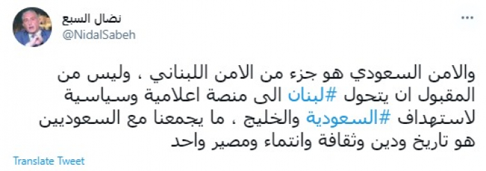 وكتب في تغريدة عبر "تويتر" رصدها "المشهد العربي": "والأمن السعودي هو جزء من الأمن اللبناني ، وليس من المقبول أن يتحول لبنان إلى منصة إعلامية وسياسية لاستهداف السعودية والخليج ، ما يجمعنا مع السعوديين هو تاريخ ودين وثقافة وانتماء ومصير واحد".