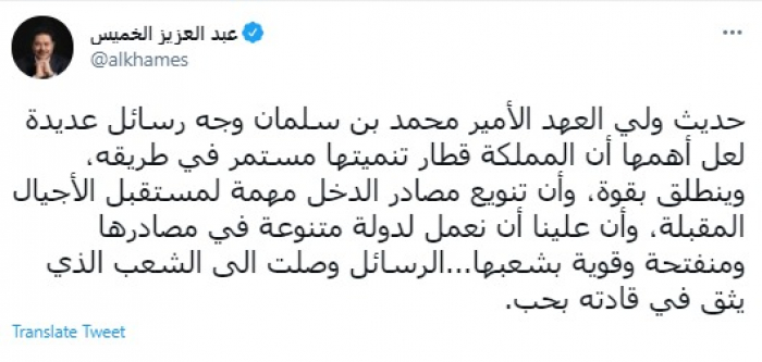 وكتب في تغريدة عبر "تويتر" رصدها "المشهد العربي": "حديث ولي العهد الأمير محمد بن سلمان وجه رسائل عديدة لعل أهمها أن المملكة قطار تنميتها مستمر في طريقه، وينطلق بقوة، وأن تنويع مصادر الدخل مهمة لمستقبل الأجيال المقبلة، وأن علينا أن نعمل لدولة متنوعة في مصادرها ومنفتحة وقوية بشعبها...الرسائل وصلت الى الشعب الذي يثق في قادته بحب".