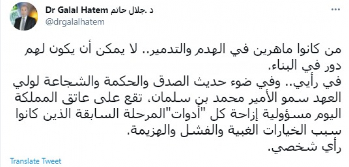 وأضاف: "في رأيي.. وفي ضوء حديث الصدق والحكمة والشجاعة لولي العهد سمو الأمير محمد بن سلمان، تقع على عاتق المملكة اليوم مسؤولية إزاحة كل أدوات المرحلة السابقة الذين كانوا سبب الخيارات ..... والفشل والهزيمة. رأي شخصي".