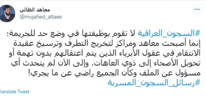 وكتب في تغريدة عبر "تويتر" رصدها "المشهد العربي": "السجون العراقية لا تقوم بوظيفتها في وضع حد للجريمة؛ إنما أصبحت معاهد ومراكز لتخريج التطرف وترسيخ عقيدة الانتقام في عقول الأبرياء الذين يتم اعتقالهم بدون تهمة أو تحويل الأصحاء إلى ذوي العاهات".