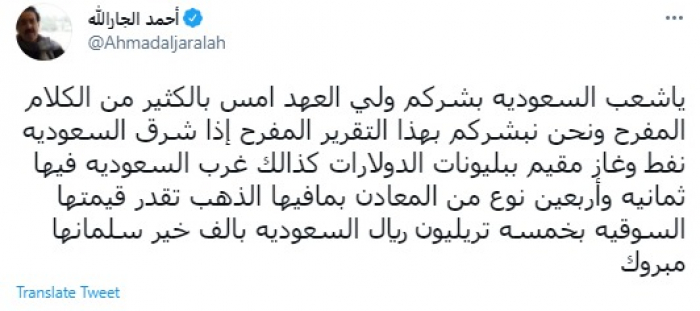 وقال في تغريدة عبر "تويتر" رصدها "المشهد العربي": "يا شعب السعودية بشركم ولي العهد أمس بالكثير من الكلام المفرح ونحن نبشركم بهذا التقرير المفرح إذا شرق السعوديه نفط وغاز مقيم ببليونات الدولارات كذالك غرب السعودية فيها ثمانية وأربعين نوع من المعادن بما فيها الذهب تقدر قيمتها السوقيه بخمسه تريليون ريال السعودية بألف خير سلمانها مبروك".