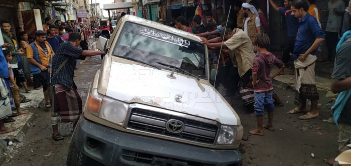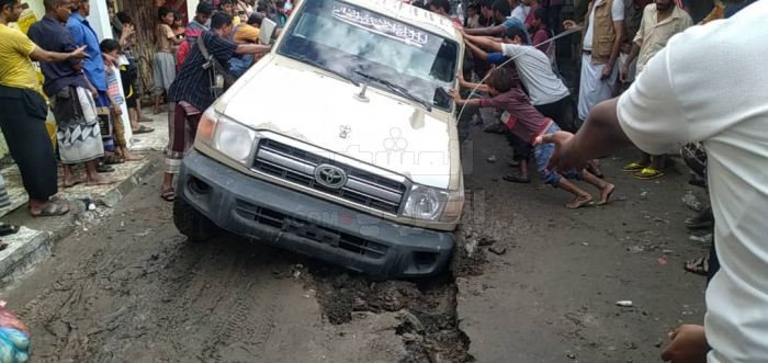 انزلقت سيارة دورية أمنية في حفرة خلفتها الأعمال الإنشائية لمشروع الصرف الصحي في جعار، بمحافظة أبين.