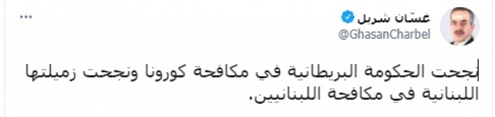 وأوضح في تغريدة على حسابه بموقع التدوين المصغر تويتر، اليوم أنه: "نجحت الحكومة البريطانية في مكافحة كورونا ونجحت زميلتها اللبنانية في مكافحة اللبنانيين".