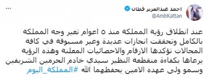 وأضاف أن: "هذه الرؤية يرعاها بكفاءة منقطعة النظير سيدي خادم الحرمين الشريفين وسمو ولى عهده الأمين يحفظهما الله"، مختتما بهاشتاج: "المملكة اليوم".