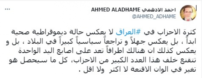 وأوضح في تغريدة على حسابه بموقع التدوين المصغر تويتر، اليوم أن: "كثرة الأحزاب في العراق لا يعكس حالة ديموقراطية صحية أبدا".