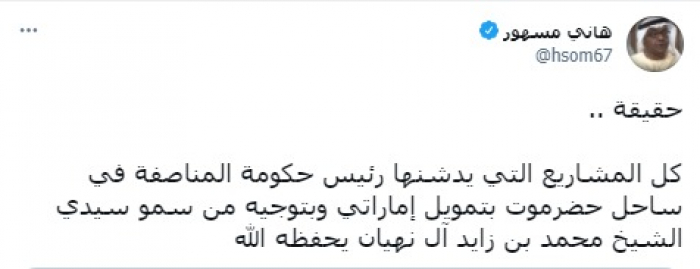 وأوضح في تغريدة على حسابه بموقع التدوين المصغر تويتر، اليوم أنه: "حقيقة .. كل المشاريع التي يدشنها رئيس حكومة المناصفة في ساحل حضرموت بتمويل إماراتي وبتوجيه من سمو سيدي الشيخ محمد بن زايد آل نهيان يحفظه الله".