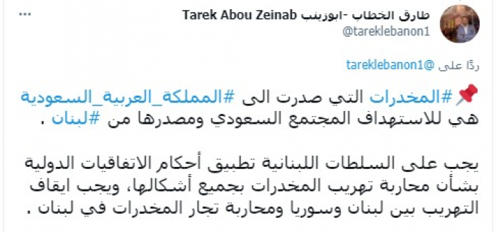 وشدد في تغريدة على حسابه بموقع التدوين المصغر تويتر، اليوم على أن: "المخدرات التي صدرت إلى المملكة العربية السعودية