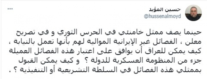 وأوضح في تغريدة على حسابه بموقع التدوين المصغر تويتر، اليوم أنه: "حينما يصف ممثل خامنئي في الحرس الثوري وفي تصريح معلن، الفصائل غير الإيرانية الموالية لهم بأنها تعمل بالنيابة، كيف يمكن للعراق أن يوافق على اعتبار هذه الفصائل العميلة جزء من المنظومة العسكرية للدولة؟".