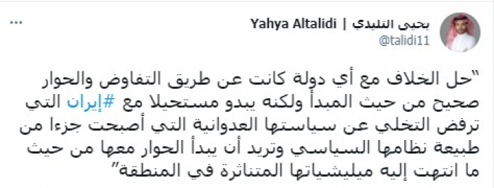 وأوضح في تغريدة على حسابه بموقع التدوين المصغر تويتر، اليوم أن: "حل الخلاف مع أي دولة كانت عن طريق التفاوض والحوار صحيح من حيث المبدأ ولكنه يبدو مستحيلا مع إيران".