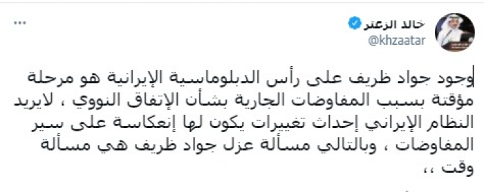 اعتبر المحلل السياسي خالد الزعتر، أن رحيل وزير الخارجية الإيراني جواد ظريف، عن موقعه، مسألة وقت إلى حين انتهاء المفاوضات بشأن الاتفاق النووي مع الغرب.
