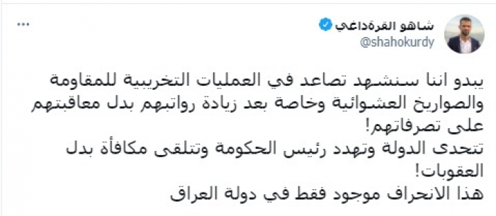 توقع الكاتب الصحفي شاهو قرة داغي تصاعد جرائم المليشيات الموالية لإيران وعمليات إطلاق الصواريخ، مهاجما قرار زيادة رواتبهم بدل من معاقبتهم على العنف.