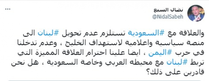 وقال في تغريدة على حسابه بموقع التدوين المصغر تويتر، اليوم إن: "العلاقة مع السعودية تستلزم عدم تحويل لبنان إلى منصة سياسية وإعلامية لاستهداف الخليج، وعدم تدخلنا في حرب اليمن".
