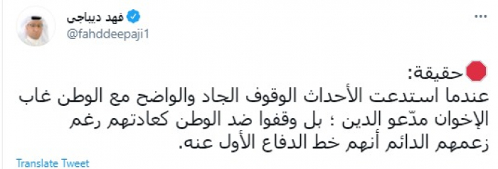وقال في تغريدة عبر "تويتر" رصدها "المشهد العربي": "حقيقة.. عندما استدعت الأحداث الوقوف الجاد والواضح مع الوطن غاب الإخوان مدّعو الدين ؛ بل وقفوا ضد الوطن كعادتهم رغم زعمهم الدائم أنهم خط الدفاع الأول عنه".