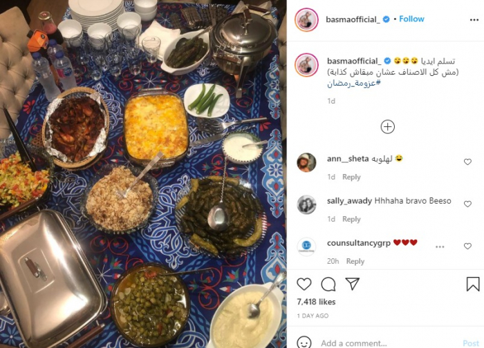 ونشرت بسمة، الصورة عبر حسابها على إنستجرام، وعلقت: "تسلم ايديا.. مش كل الأصناف عشان مبقاش كذابة.. عزومة رمضان".