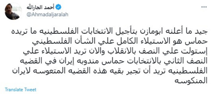 وقال في تغريدة عبر "تويتر" رصدها "المشهد العربي": "جيد ما أعلنه أبو مازن بتأجيل الانتخابات الفلسطينية ما تريده حماس هو الاستيلاء الكامل على الشأن الفلسطيني استولت على النصف بالانقلاب والآن تريد الاستيلاء على النصف الثاني بالانتخابات".