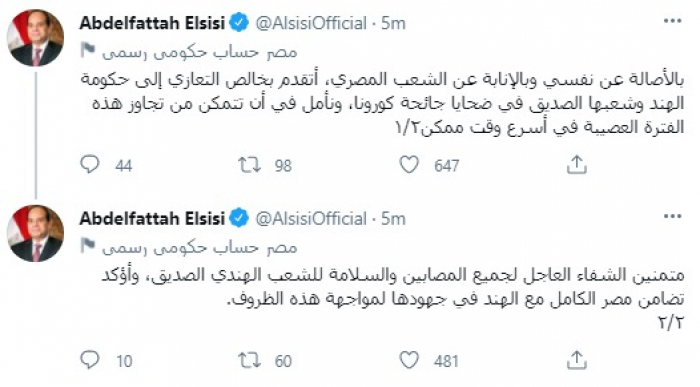 وقال في تغريدات عبر "تويتر" رصدها "المشهد العربي": "بالأصالة عن نفسي وبالإنابة عن الشعب المصري، أتقدم بخالص التعازي إلى حكومة الهند وشعبها الصديق في ضحايا جائحة كورونا، ونأمل في أن تتمكن من تجاوز هذه الفترة العصيبة في أسرع وقت ممكن".