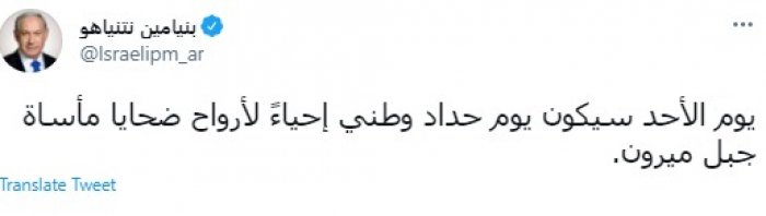 وقال في تغريدة عبر "تويتر" رصدها "المشهد العربي": "يوم الأحد سيكون يوم حداد وطني إحياءً لأرواح ضحايا مأساة جبل ميرون".