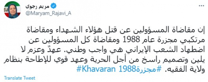 وقالت في تغريدة عبر "تويتر" رصدها "المشهد العربي": "إن مقاضاة المسؤولين عن قتل هؤلاء الشهداء ومقاضاة مرتكبي مجزرة عام 1988 ومقاضاة كل المسؤولين عن اضطهاد الشعب الإيراني هي واجب وطني. عهدٌ وعزم لا يلين وتصميم راسخ من أجل الحرية وعهد قوي للإطاحة بنظام ولاية الفقيه. مجزرة1988 ".