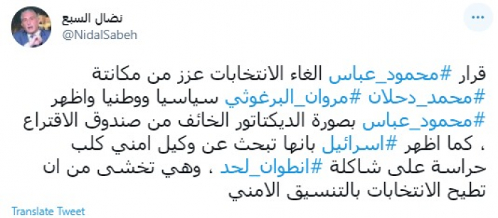 وقال في تغريدة عبر "تويتر" رصدها "المشهد العربي": "قرار محمود عباس إلغاء الانتخابات عزز من مكانة محمد دحلان ومروان البرغوثي سياسيا ووطنيا وأظهر محمود عباس بصورة الديكتاتور الخائف من صندوق الاقتراع".