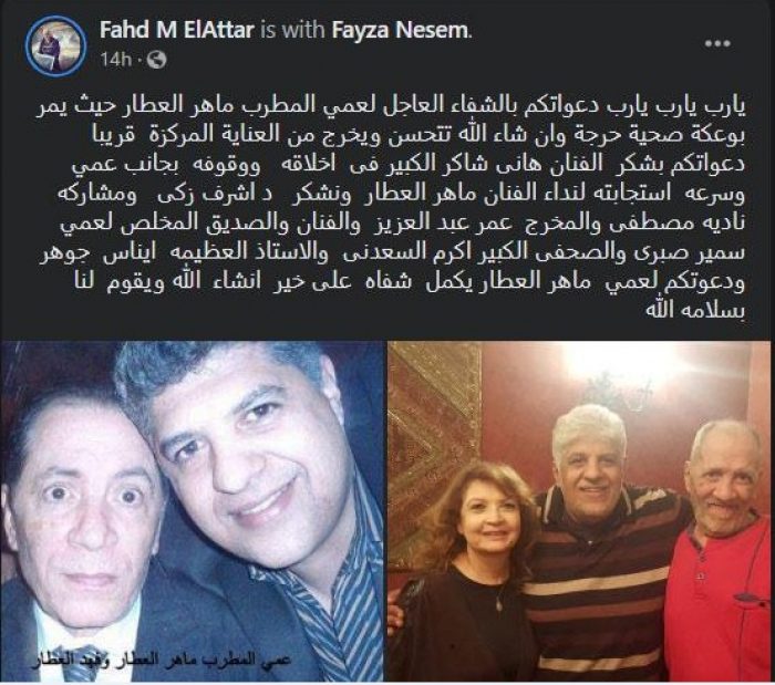 وتابع "بشكر الفنان هاني شاكر الكبير لأخلاقه ووقوفه بجانب عمي وسرعة استجابته لنداء الفنان ماهر العطار، ونشكر د.أشرف زكي ومشاركة نادية مصطفى والمخرج عمر عبدالعزيز والفنان والصديق المخلص لعمي سمير صبري والصحفي الكبير أكرم السعدني والأستاذة العظيمة إيناس جوهر، ودعواتكم لعمي ماهر العطار يكمل شفاه على خير ان شاء الله ويقوم لنا بسلامة الله".