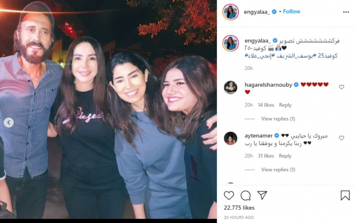 وظهرت إنجي في الصور رفقة يوسف الشريف وأيتن عامر وعلقت عبر حسابها بـ "إنستجرام" قائلة: "فركش تصوير كوفيد 25".