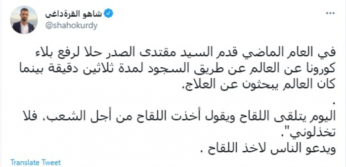علق الكاتب الصحفي العراقي شاهو القرةداغي، اليوم، على دعوة زعيم التيار الصدري مقتدى الصدر للعراقيين بتلقي لقاح كورونا.