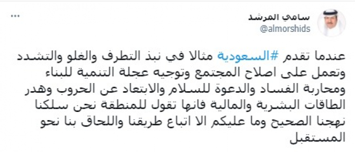 وأوضح في تغريدة على حسابه بموقع التدوين المصغر تويتر، اليوم أنه: "عندما تقدم السعودية مثالا في نبذ التطرف والغلو والتشدد وتعمل على إصلاح المجتمع وتوجيه عجلة التنمية للبناء ومحاربة الفساد والدعوة للسلام والابتعاد عن الحروب وهدر الطاقات البشرية والمالية".