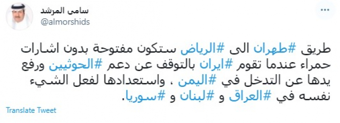 وقال في تغريدة عبر "تويتر" رصدها "المشهد العربي": "طريق طهران إلى الرياض ستكون مفتوحة بدون إشارات حمراء عندما تقوم إيران بالتوقف عن دعم الحوثيين ورفع يدها عن التدخل في اليمن".