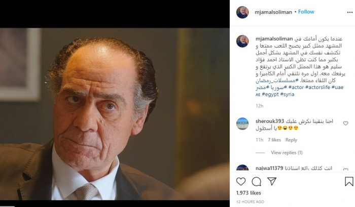 ونشر سليمان صورة أحمد فؤاد سليم، عبر حسابه الشخصي على موقع "إنستجرام"، معلقًا "عندما يكون أمامك في المشهد ممثل كبير يصبح اللعب ممتعا، وتكتشف نفسك في المشهد بشكل أجمل بكثير مما كنت تظن. الأستاذ أحمد فؤاد سليم هو هذا الممثل الكبير الذي يرتفع ويرفعك معه. أول مرة نلتقي أمام الكاميرا وكان اللقاء ممتعا".