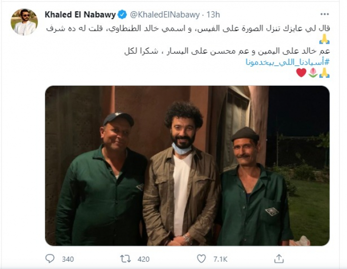 ونشر النبوي، صورة تجمعه بعاملين، عبر حسابه على تويتر، وعلق: "قال لي عايزك تنزل الصورة على الفيس، و اسمي خالد الطنطاوي، قلت له ده شرف.. عم خالد على اليمين وعم محسن على اليسار.. شكرا لكل أسيادنا اللي بيخدمونا".