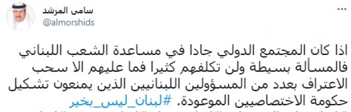 وقال في تغريدة عبر "تويتر" رصدها "المشهد العربي": "إذا كان المجتمع الدولي جادا في مساعدة الشعب اللبناني فالمسألة بسيطة ولن تكلفهم كثيرا فما عليهم الا سحب الاعتراف بعدد من المسؤولين اللبنانيين الذين يمنعون تشكيل حكومة الاختصاصيين الموعودة".