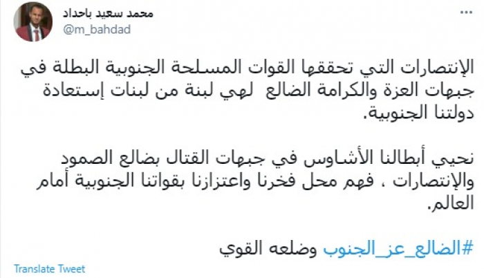 وقال في تغريدة عبر "تويتر" رصدها "المشهد العربي": "الانتصارات التي تحققها القوات المسلحة الجنوبية البطلة في جبهات العزة والكرامة الضالع لهي لبنة من لبنات استعادة دولتنا الجنوبية".