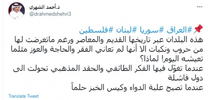 كشف المحلل السياسي السعودي الدكتور أحمد الشهري، اليوم، سبب نكبات العراق وسوريا ولبنان وفلسطين.