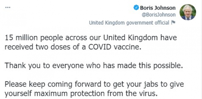 وقال في تغريدة على حسابه بموقع التدوين المصغر تويتر، اليوم إنه: "تلقى 15 مليون شخص في جميع أنحاء المملكة المتحدة جرعتين من لقاح كوفيد".