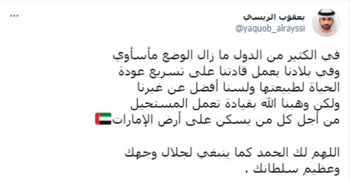 وشدد في تغريدة على حسابه بموقع التدوين المصغر تويتر، اليوم على أنه: "في الكثير من الدول ما زال الوضع مأساوي وفي بلادنا يعمل قادتنا على تسريع عودة الحياة لطبيعتها".