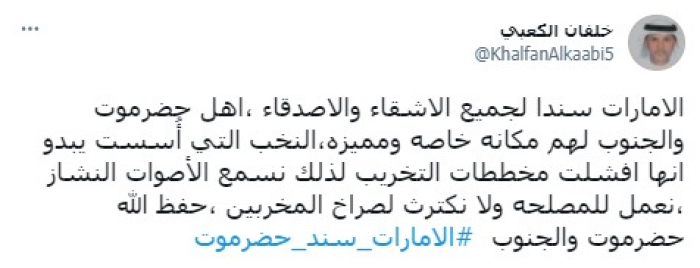 وأشار في تغريدة على حسابه بموقع التدوين المصغر تويتر، اليوم إلى أن: "الإمارات سند لجميع الأشقاء والأصدقاء، أهل حضرموت والجنوب لهم مكانة خاصة ومميزة".