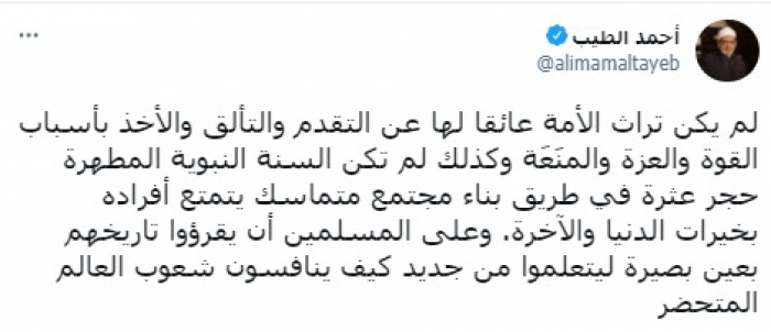 أكد الإمام الأكبر الدكتور أحمد الطيب، شيخ الأزهر الشريف، أن تراث الأمة لا يعيقها عن التقدم والتطور، نافيا أن تكون السنة النبوية حجر عثرة للمجتمعات المتماسكة.
